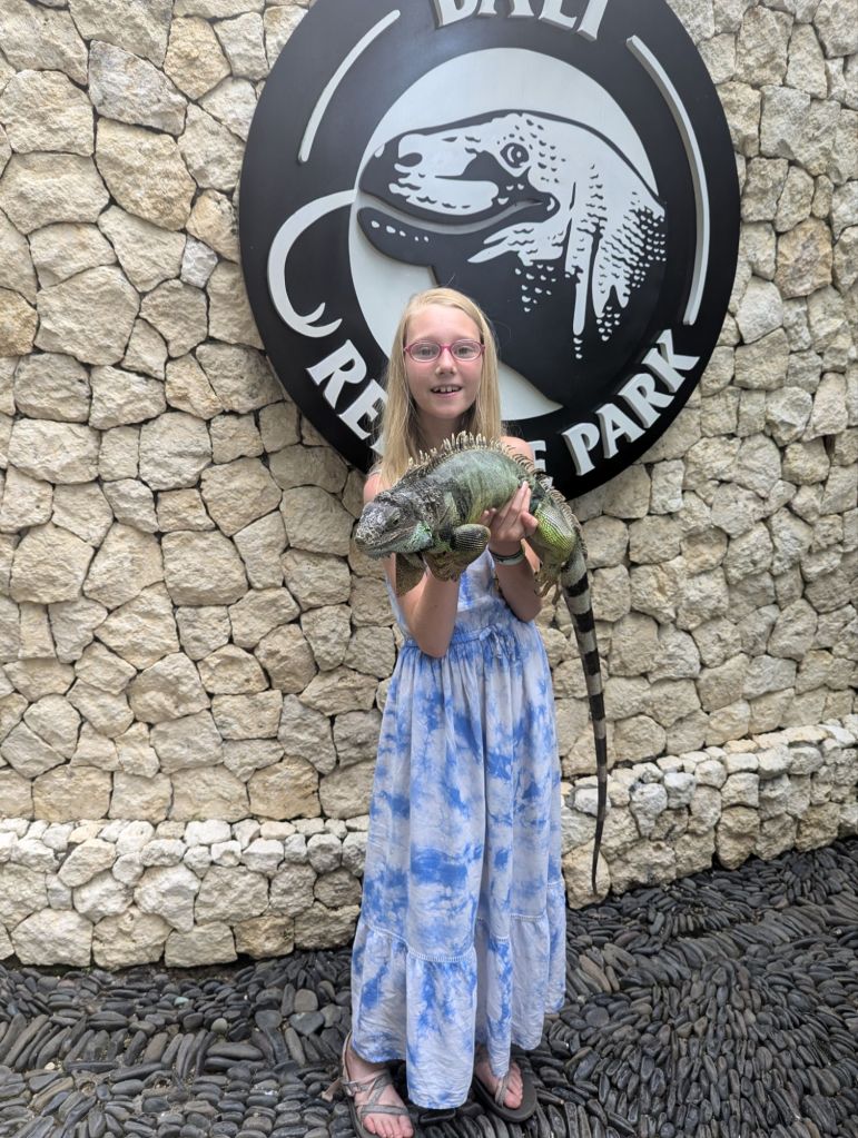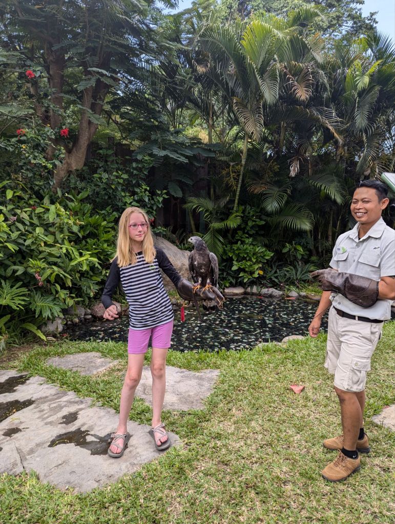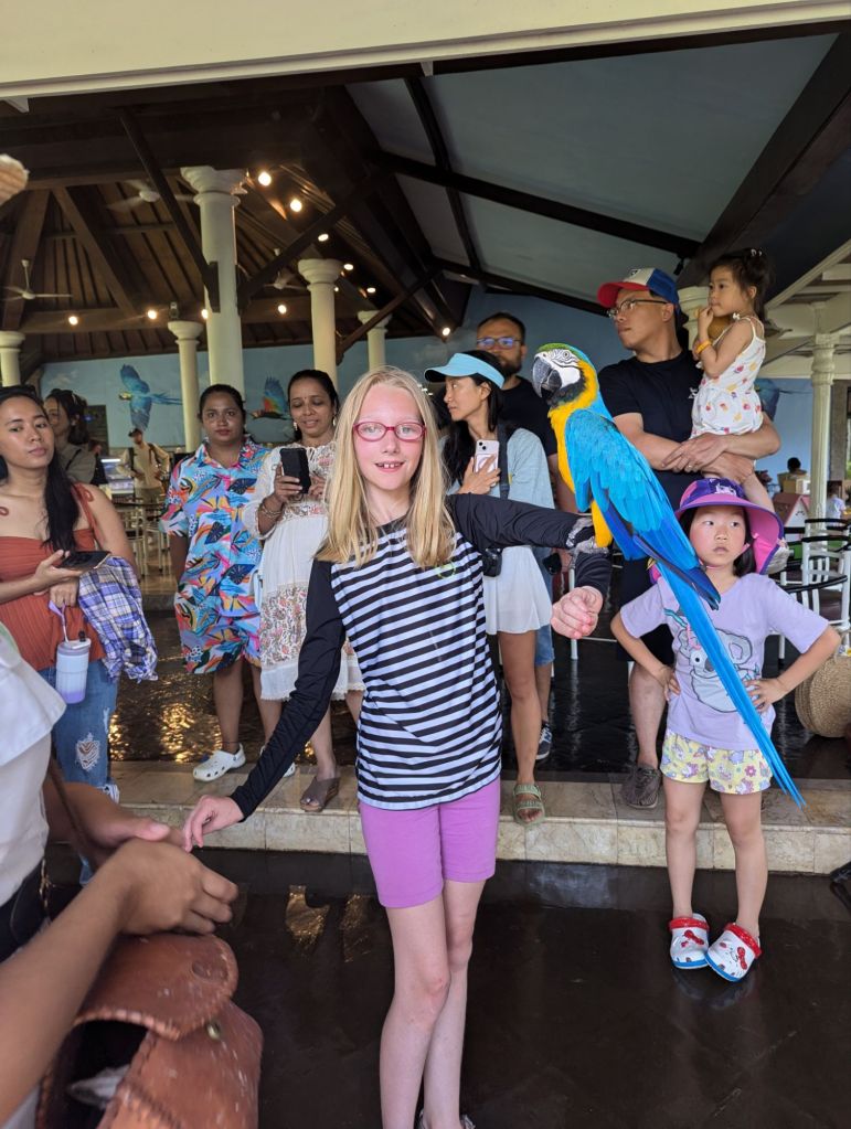 My favorite thing we have done so far is the Bali Bird Park. I got to hold a lot of birds and feed pelicans, ducks, and even a Komodo dragon! Did you know Komodo dragons only eat twice a week because they have very slow digestion? I got chosen to dress up and feed all the ducks for the bird show. Did you know some birds aren’t raptors even though they do eat meat? Some birds eat nuts, fruits, and seeds though.