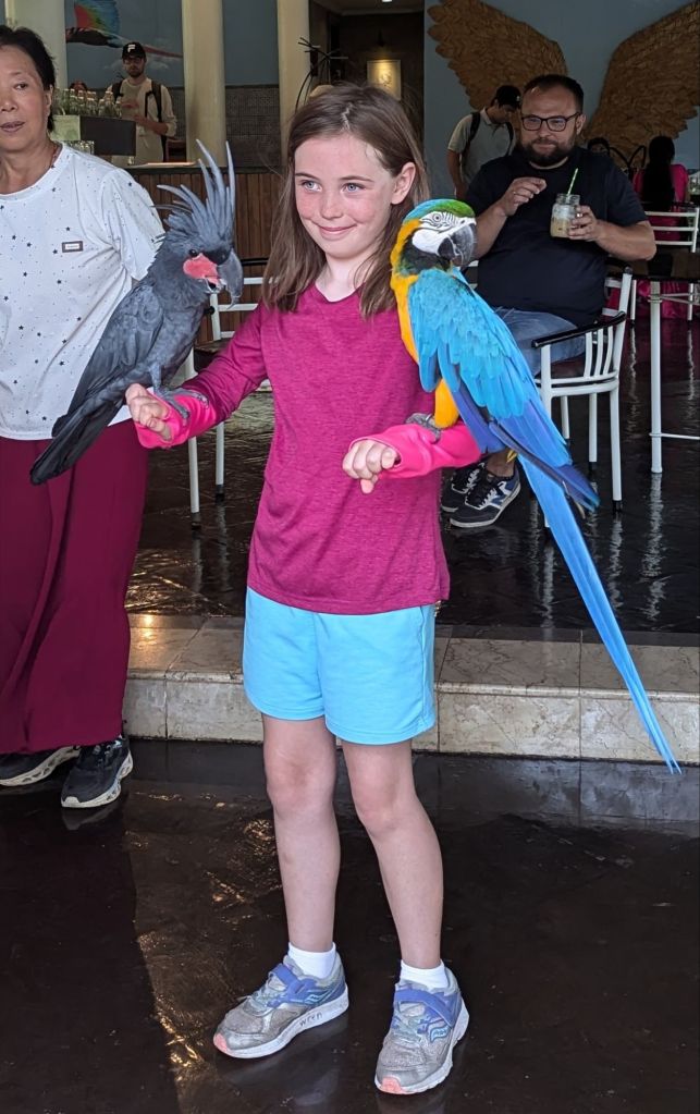 We went to the bird park. It was fun. I got to hold a lot of birds like a McCaw, a parrot, and a falcon. The green parrot was my friend. One of the duck birds(cormorant) bit my finger when I was feeding it and it was bleeding. I have a little scar now and I like it. We also got to feed a komodo dragon. I got to hold a tray up on my head and some birds were diving and eating off of it during a show.