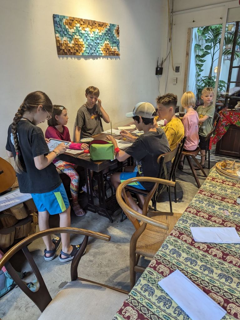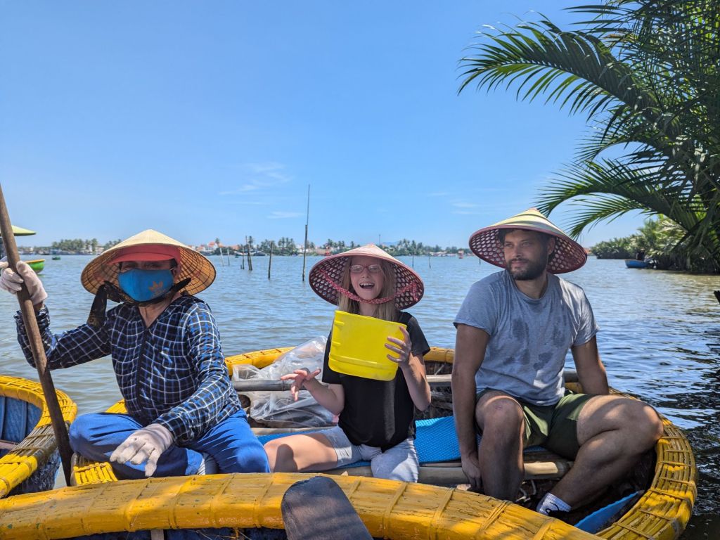 We went to a cooking class, a lantern making class, and a coconut boat trip. I went on one of the boats that spun really fast. I had to hold on tight. I caught a crab and held it in a jug. We made some Vietnamese dishes, like some cao lau. They were yummy. I made a purple and yellow lantern with pink trim. It’s for romance, love, and luck.