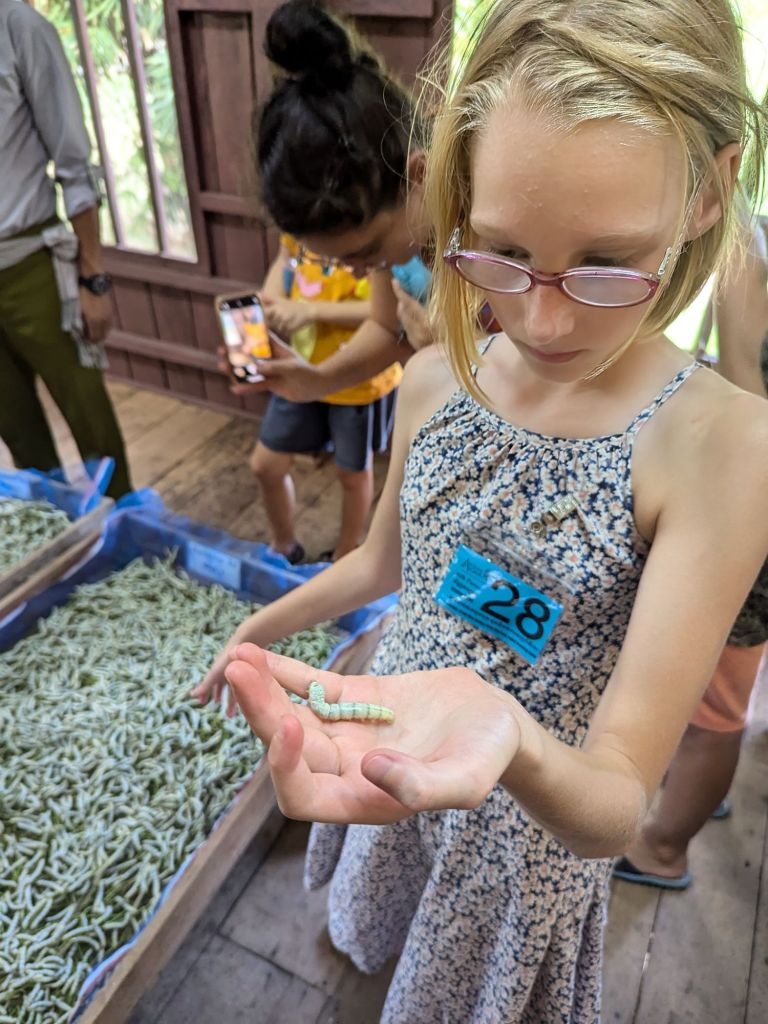 Silk is made from the cocoons of silkworms. We got to tour a silkworm farm that taught us all about it. First, we learned the life cycle of the silk worms. They start off as eggs, they hatch, eat a lot and grow really fast, then spin cocoons. Some of them turn into moths to lay more eggs. Most of them, the silk farmers put out in the sun to dry up and they die. Then, the farmers take the cocoons and put them in pots to clean them and unravel them. Then, they turn the fibers into thread. After the thread is made, they dye it with all different plants to make different colors. My favorite was the purple. When the thread is dyed and dry, they weave it into fabric using big looms. I got to try to work one of the looms, it was very hard, definitely a two handed job.