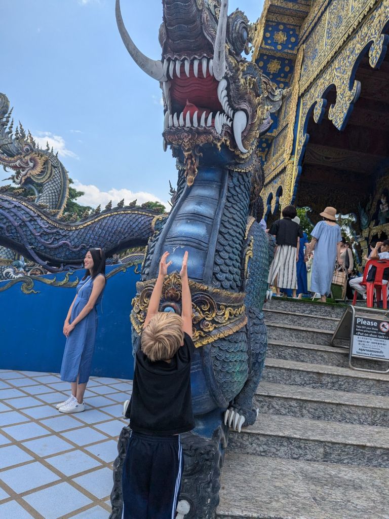 We also went to a blue temple, a red and white temple, and a completely white temple. It was a long drive in a van to get to those temples because they were in a different city than us. My favorite one that day was the blue temple. The railings were snakes. Inside we got to see Buddhist people praying at a shrine.