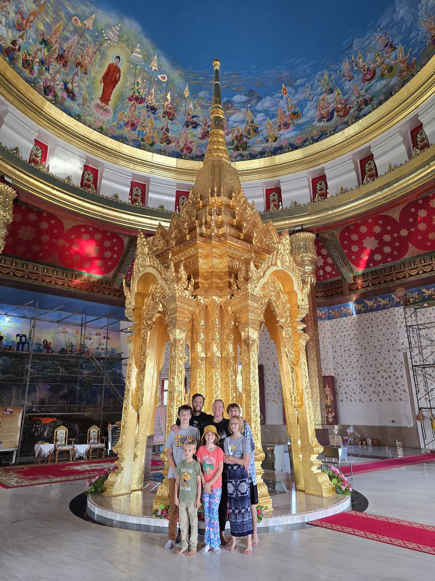 We went to a lot of temples in Thailand. My favorite one was on top of a tall hill with a glass walkway that was really high up. I could see really far all around and beneath me. Inside the temple, they were painting it. On the ceiling there were pictures of a bunch of gods, I think. In the middle was a golden shrine. A shrine is a statue or place where people offer things to the gods and pray.